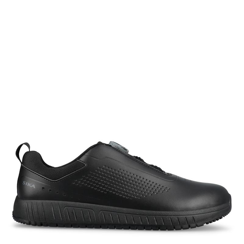 Trainer-like work shoes with the BOA® Fit System - perfect for waiters and other kitchen staff. The original BOA® Fit System lets you put on and take off the shoes quickly, and guarantees a perfect fit every time. The smooth microfibre upper with stylish, minimalist details makes the shoes very resistant to dirt while also repelling water and other liquids. The outsole consists of the innovative technology SIKA HexaGrip. The sole is made of durable rubber, and the sole pattern consists of multiple hexagons, contributing to 360° slip resistance and easily redirect liquids away from the sole, providing better grip on indoor surfaces. The soft EVA foam midsoles make the shoes flexible, lightweight and uniquely shock-absorbing. Air bubbles in both the midsoles and outsoles, SIKA BubbleTech, ensure excellent shock absorption, making each step feel lighter and your workday more comfortable. The work shoes are PVC-free and ESD-approved.