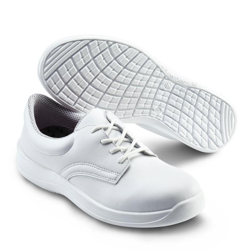 Flexible and lightweight shoe made from water resistant microfibre. Lightweight PU outsole. Washable, metal free and with composite toe cap.