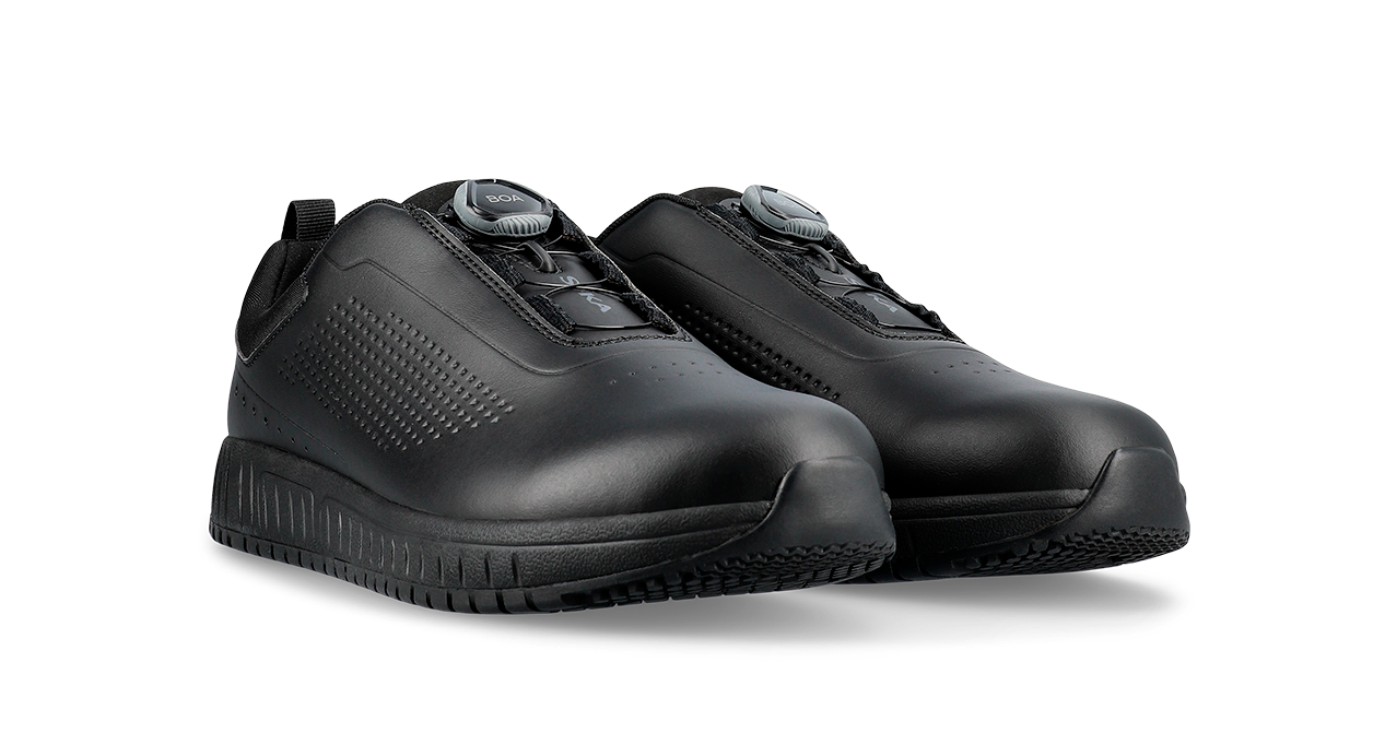 Trainer-like work shoes with the BOA® Fit System. The smooth microfibre upper with stylish, minimalist details makes the shoes very resistant to dirt while also repelling water and other liquids. The outsoles are made of durable rubber, and the sole pattern consists of numerous hexagons that contribute to 360° slip resistance. Air bubbles in both the midsoles and outsoles ensure excellent shock absorption.
